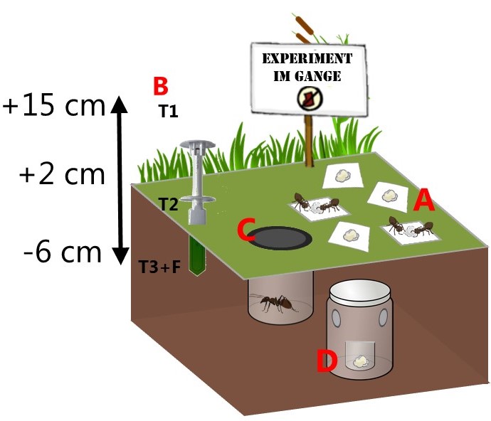 Das Projekt wird im Mai oder anfang Juni in den Städten Berlin, Halle und Leipzig mit 20 Schulen durchgeführt. Im Unterricht werden die Schülerinnen und Schüler in Gruppen eingeteilt und die Ameisenaktivität auf dem Schulhof aufgezeichnet. Dazu werden Köderfallen ausgelegt und beobachtet, wie schnell die Ameisen die Futterquelle entdecken und weitere Ameisen rekrutieren (Schritt A im Bild). Die Kinder sollen zudem testen, welche Auswirkungen verschiedene Standorte haben: Licht vs. Schatten, Asphalt/Pflasterstein vs. Rasen. In dem Bausatz sind auch Mikroklimalogger mit denen die Temperatur an den Standorten aufgezeichnet werden kann (Schritt B im Bild).